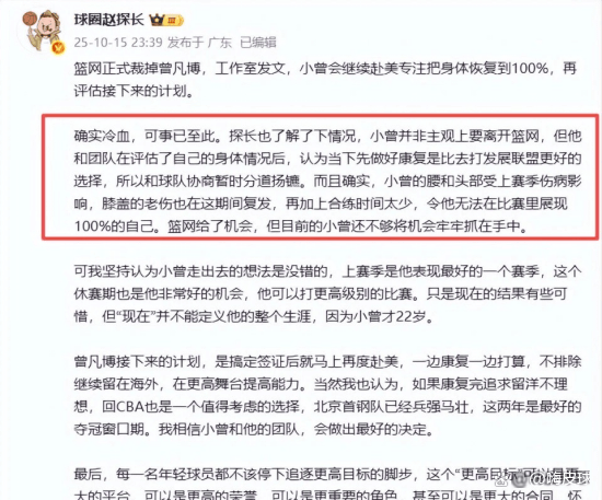 媒体人赵探长说,曾凡博和他团队商量了,觉得现在养好身体比打发展联盟更重要,所以就跟球队说先分开了。