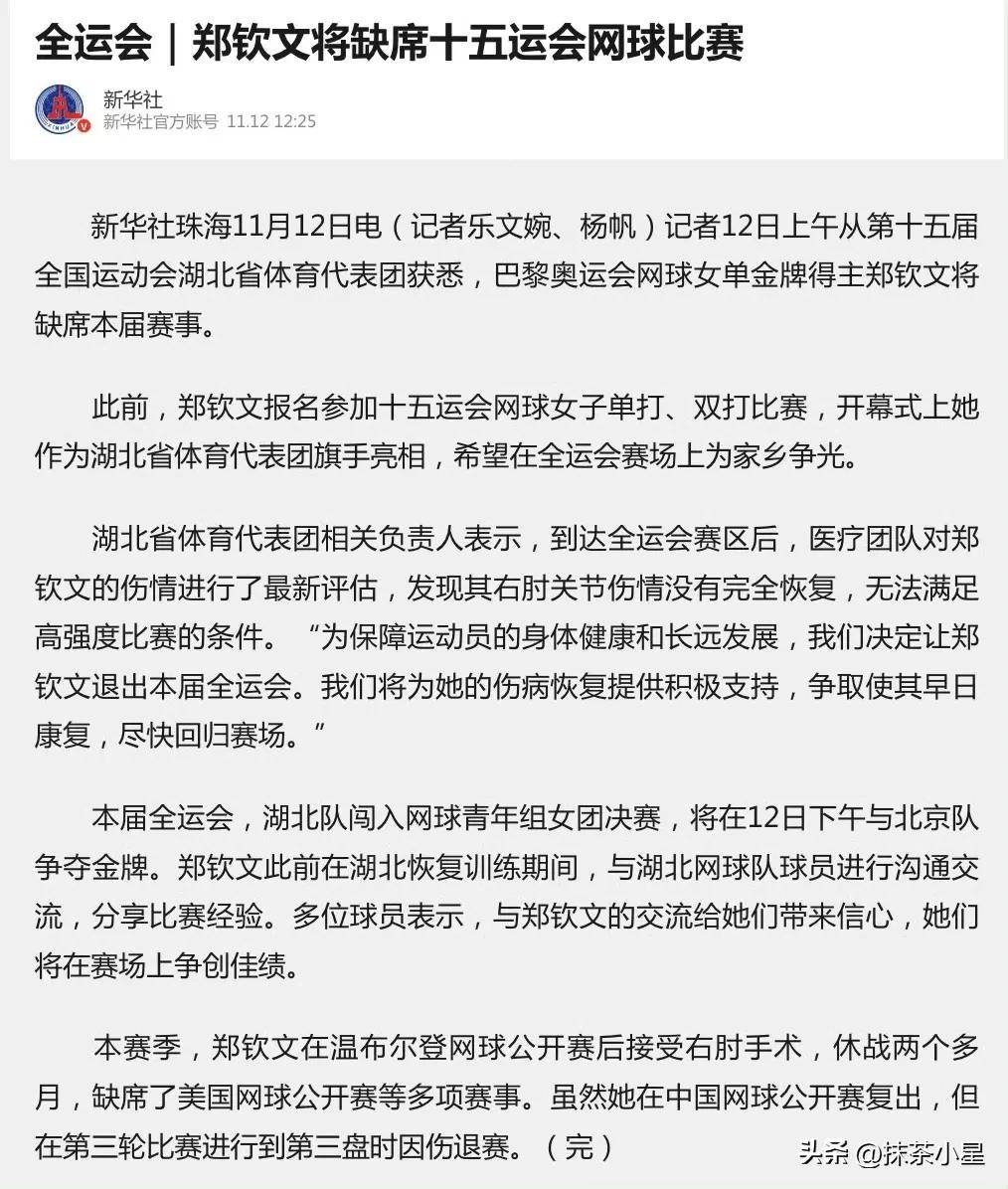 在退赛之前,郑钦文曾出现在全运会开幕式的运动员入场仪式上,作为湖北队的旗手,她挥动旗帜的画面既优雅又充满力量,展现了她的风采。尽管如此,原本报名参加了女单和女双两个项目的她,最终未能如约参赛。对此,湖北省体育代表团回应称:“在郑钦文抵达全运会赛区后,医疗团队对她的伤情进行了重新评估,发现她的右肘关节伤势尚未完全恢复,无法承受高强度比赛。”