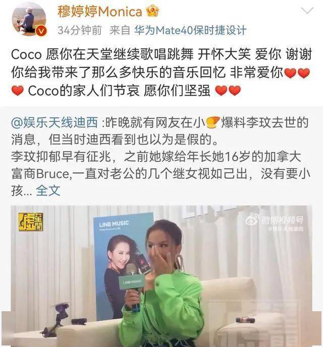 演员穆婷婷发文悼念Coco称“愿你在天堂继续歌唱跳舞,开怀大笑,爱你,谢谢你给我带来了那么多快乐的音乐回忆,非常爱你,Coco的家人们节哀,愿你们坚强”,太惋惜了!