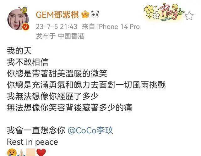 邓紫棋同样不敢相信,一时难以接受,回忆起与李玟的点滴,想起自己看到过的李玟,她说李玟总是带着甜美温暖的微笑,总是充满勇气和魄力去面对一切风雨挑战,无法想象李玟究竟经历了多少困难,也无法想象微笑背后藏着多少难以言说的苦痛,“我会一直想念你”,邓紫棋走心了。